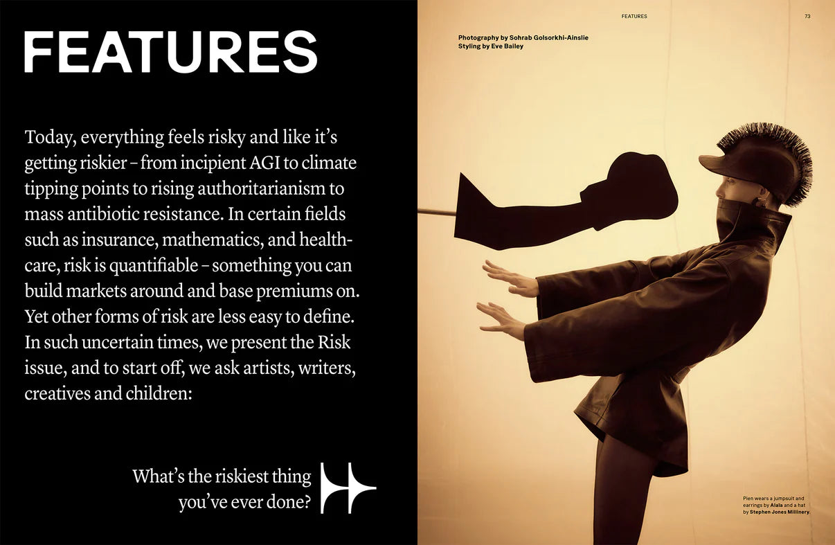 Questo numero di Tank magazine prende il rischio come lente attraverso cui leggere cultura, politica e immaginario contemporaneo. Tai Shani e Sophia Al-Maria riflettono sull’arte dopo Gaza, mentre l’economista Ann Pettifor descrive un sistema finanziario sempre più simile a un casinò. Ayesha A. Siddiqi analizza i prediction markets come sintomo di un futuro che si restringe, mentre una serie di contributi indaga la figura di Elon Musk come emblema del nostro tempo.